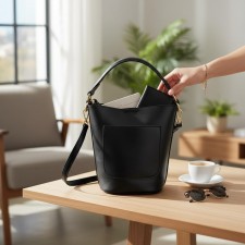 Bolsillo exterior y broches dorados. Elagante de tamaño comodo y practico. Tonos neutros que combinaran con cualquier look.
