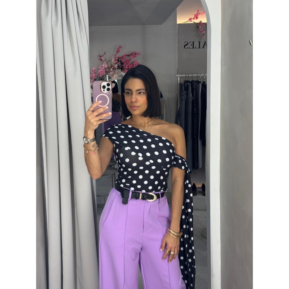 Un diseño lleno de carácter y estilo. Esta blusa de un solo hombro con lazo lateral aporta un aire sofisticado y femenino, ideal para destacar en cualquier ocasión. Su estampado de lunares clásicos se mezcla con un corte moderno que realza la silueta.