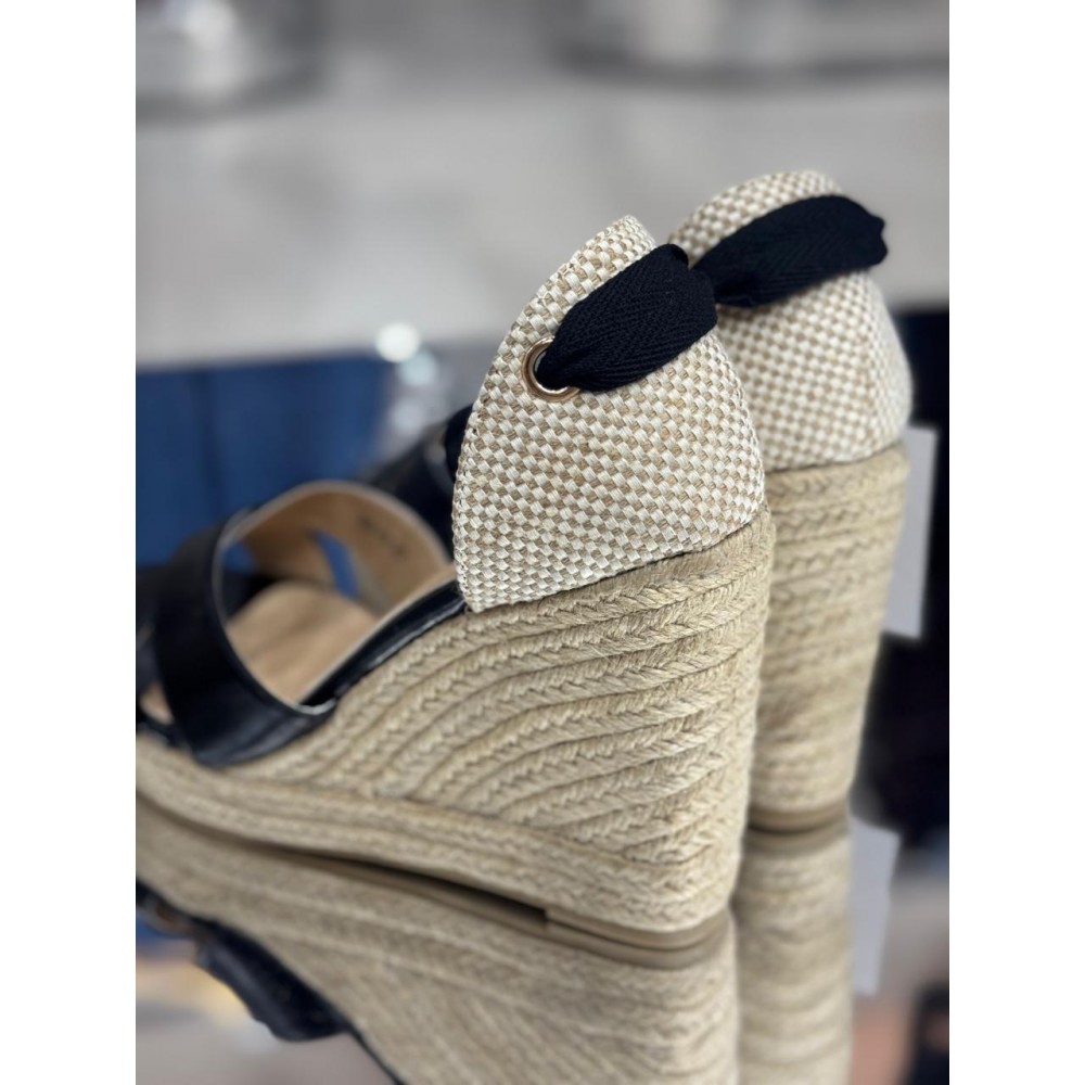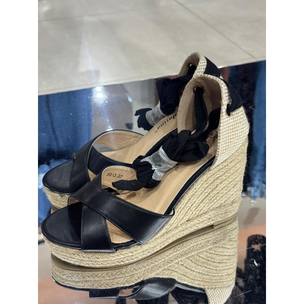 Estas sandalias tipo cuña combinan lo mejor del estilo veraniego con un toque moderno y sofisticado. Su plataforma de yute trenzado aporta estabilidad y un look natural, mientras que las tiras negras cruzadas en eco-cuero añaden contraste y elegancia.