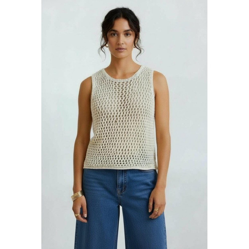 Nuestro top tejido calado en tono arena es la pieza ideal para looks veraniegos, relajados y ultra chic. Su diseño artesanal con fibras suaves crea un efecto visual moderno y liviano, perfecto para llevar sobre tops básicos, bikinis o bralettes.