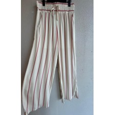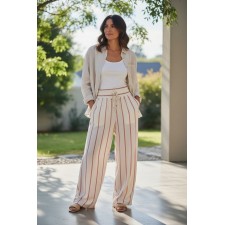 Este pantalón es sinónimo de comodidad sofisticada y estilo natural. Confeccionado en una tela liviana y fresca, su diseño de rayas verticales en tonos beige y rosa empolvado estiliza la silueta y alarga visualmente las piernas, creando un efecto favorecedor y femenino.