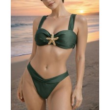 Este bikini en tono verde oliva es una pieza que transmite sofisticación, conexión con la naturaleza y seguridad femenina. Su diseño clásico se eleva con un delicado aplique de estrella dorada al centro del top, aportando un detalle joya que realza el busto de forma sutil y elegante.