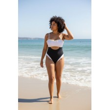 Este traje de baño entero es una pieza que celebra la elegancia clásica con un toque moderno. Su diseño bicolor en blanco y negro crea un efecto visual que estiliza la silueta, mientras el delicado detalle de perlas en el escote aporta sofisticación y un aire femenino único.