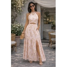 Escote halter realza hombros y cuello, mientras el cut out sutil en la cintura aporta un toque moderno y femenino que estiliza la silueta sin perder delicadeza.