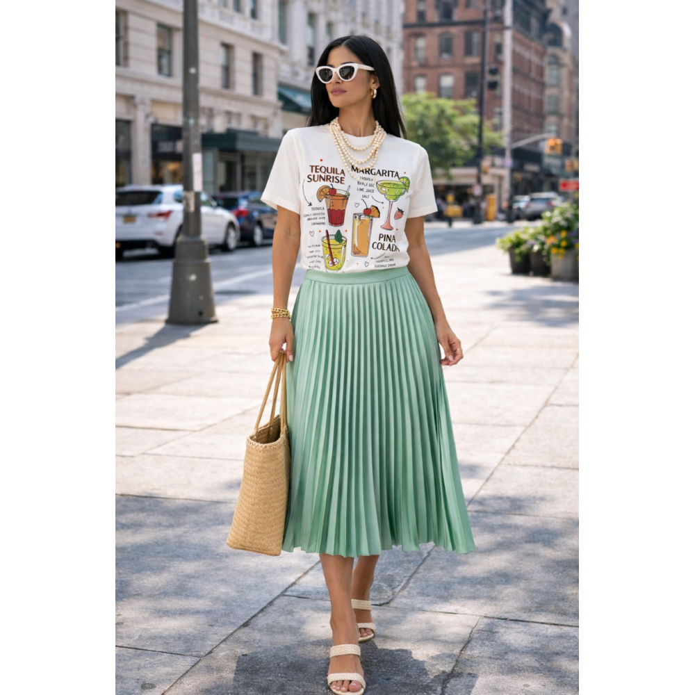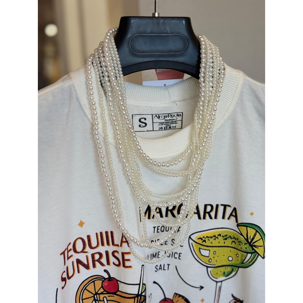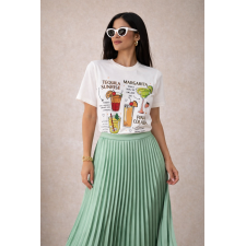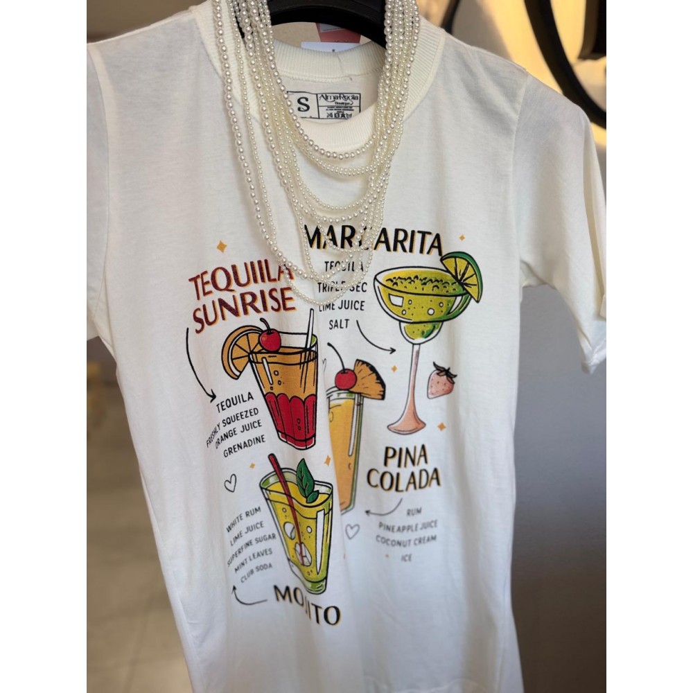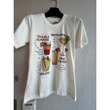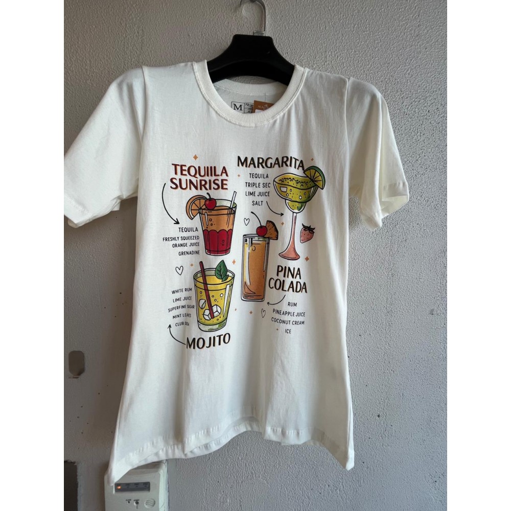 Confeccionada en 100% algodón suave, esta polera blanca destaca por su estampado ilustrado de cócteles icónicos —Tequila Sunrise, Margarita, Mojito y Piña Colada— que aportan color, frescura y un aire veraniego irresistible.