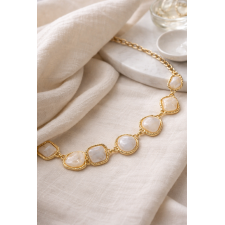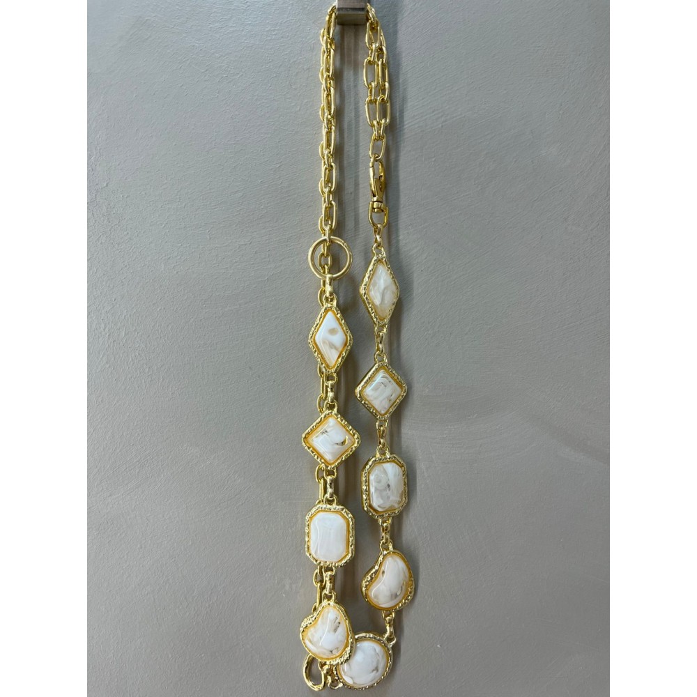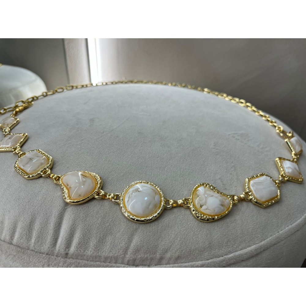Las piezas orgánicas en tonos marfil nacarado, enmarcadas en metal dorado, crean un juego de luces sutil que aporta elegancia sin excesos. Su formato tipo cadena lo hace ideal para marcar la cintura sobre vestidos, faldas o pantalones de tiro alto, transformando prendas simples en outfits memorables.