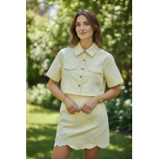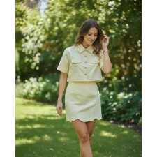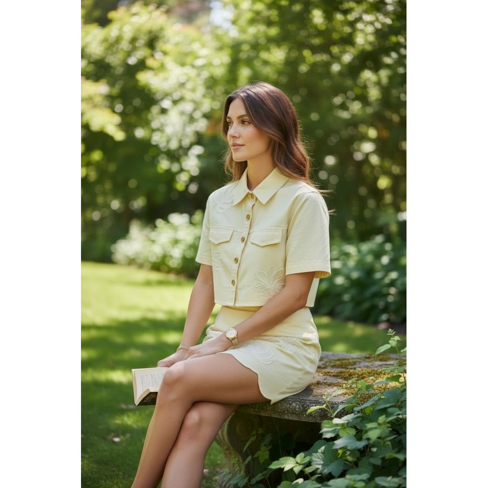 El top tipo chaqueta cropped presenta una silueta estructurada con botones frontales y bolsillos, equilibrando modernidad y estilo clásico. La falda mini complementa el look con un calce favorecedor que estiliza la figura, mientras sus bordados en relieve aportan textura, detalle artesanal y un aire romántico muy Alma Regia.