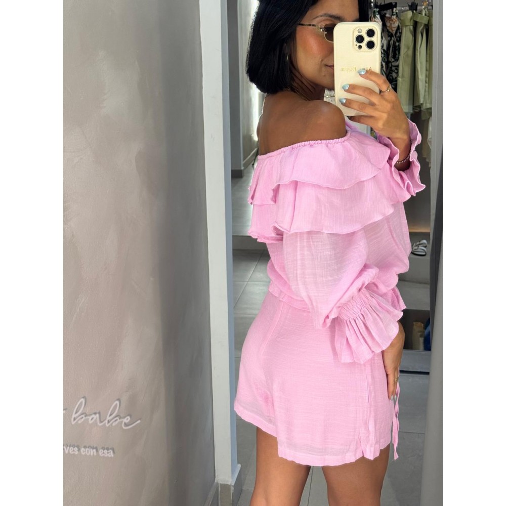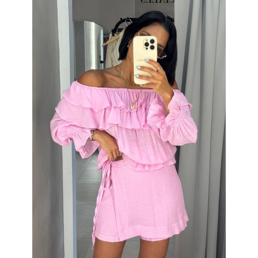 La blusa off shoulder con delicados vuelos realza los hombros y aporta un efecto etéreo y sofisticado, mientras que las mangas con volumen suave equilibran el look con un toque chic. El short de tiro alto, con caída fluida y ajuste delicado en la cintura, estiliza la silueta y aporta comodidad sin perder elegancia.