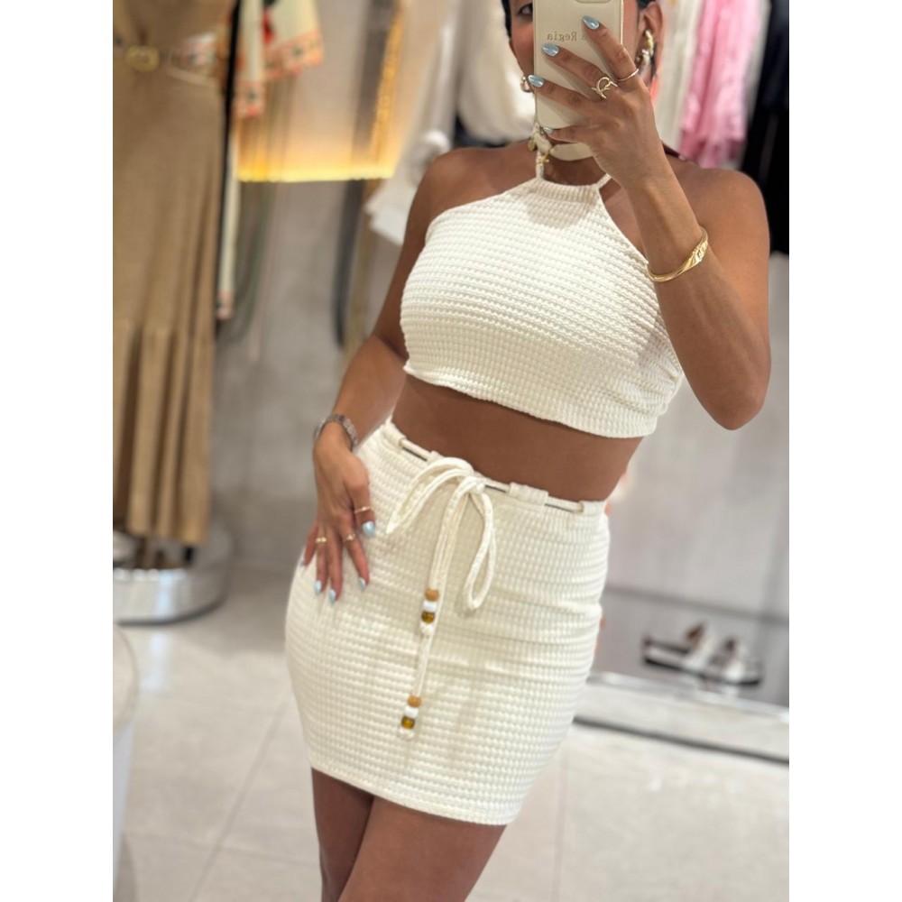Compuesto por un top halter de delicada textura con amarre regulable en espalda y una falda mini de tiro medio–alto, crea una silueta armónica que realza la figura con naturalidad y frescura.