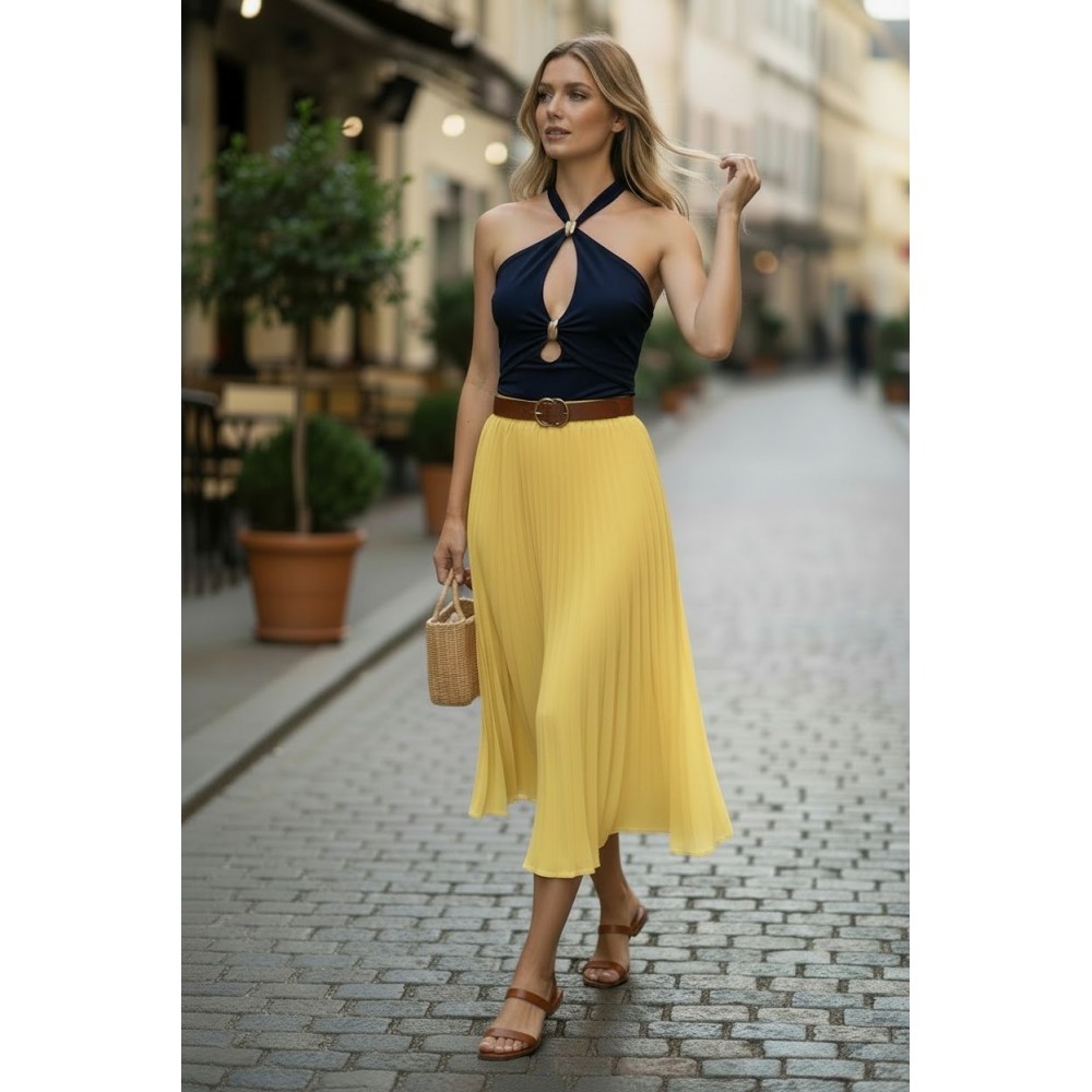 Este body azul marino es una pieza icónica que combina sensualidad sofisticada con un diseño que estiliza naturalmente la silueta. Su escote halter con detalles dorados y cortes estratégicos crea un efecto visual que realza el busto, define la cintura y alarga el torso, logrando un look elegante, poderoso y ultra favorecedor.