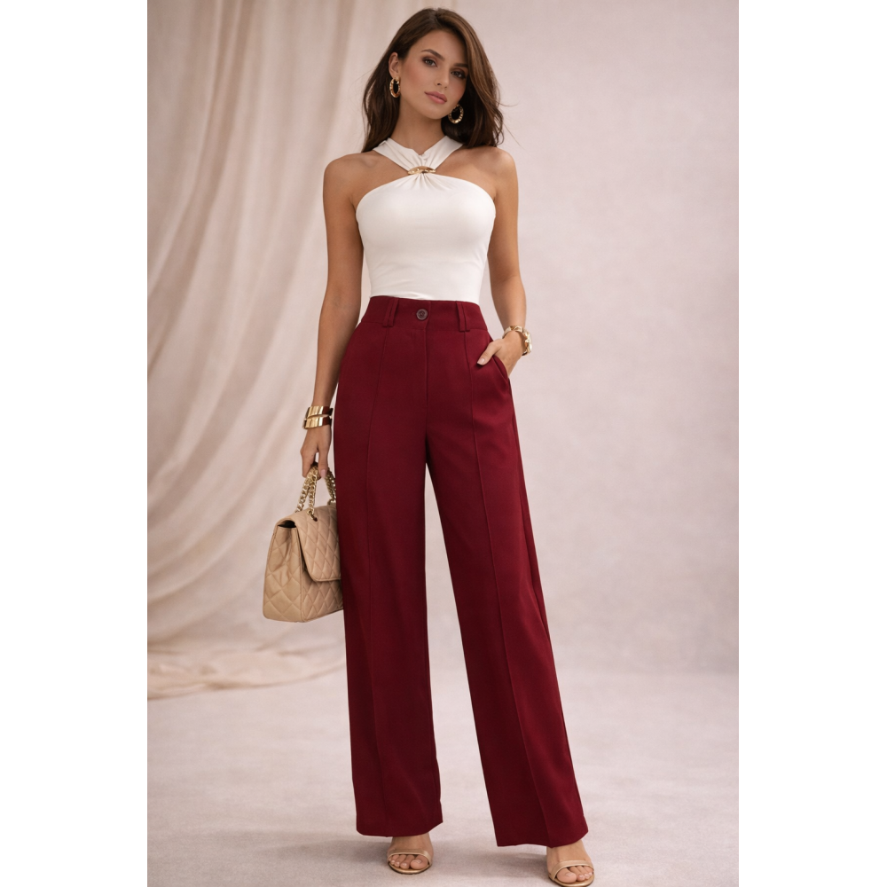 Este pantalón es una pieza infaltable en un clóset consciente y sofisticado. Su tiro alto estiliza la silueta, define la cintura y alarga visualmente las piernas, mientras su calce recto y fluido aporta movimiento y frescura.
