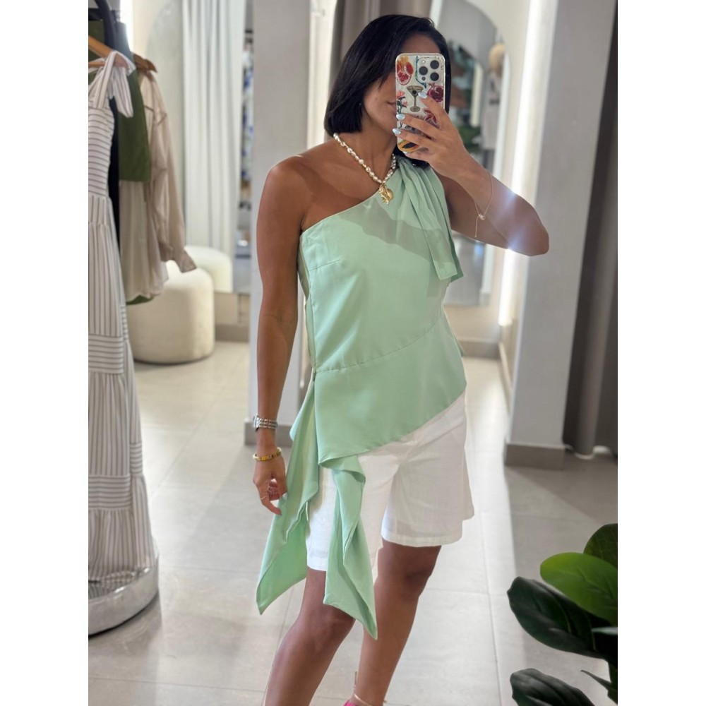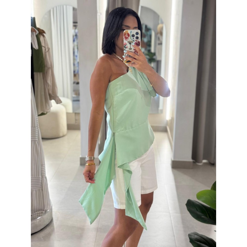 El detalle de caída fluida lateral añade movimiento y feminidad, logrando un efecto visual delicado y muy favorecedor. Su tono verde menta ilumina la piel y transmite frescura, perfecta para looks de día elegantes o eventos especiales en climas cálidos.