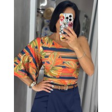 Su escote a un hombro crea una silueta moderna y favorecedora, mientras que la manga amplia tipo murciélago aporta fluidez y comodidad, equilibrando visualmente la figura. El calce ligeramente entallado en la cintura estiliza el torso y permite combinarlo fácilmente con pantalones o faldas de tiro alto.