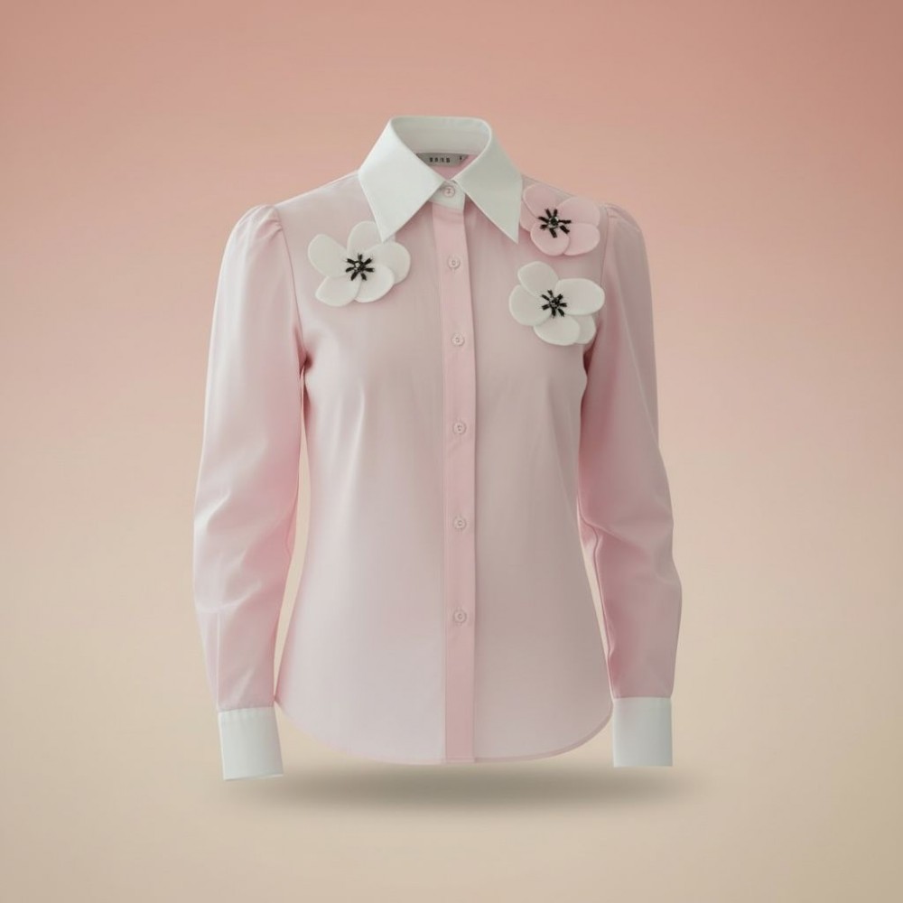 Una blusa que combina delicadeza, elegancia y un toque femenino muy especial. Su tono rosa pastel ilumina el rostro y aporta suavidad al look, mientras que los apliques florales en relieve elevan la prenda, convirtiéndola en un statement sutil pero inolvidable.