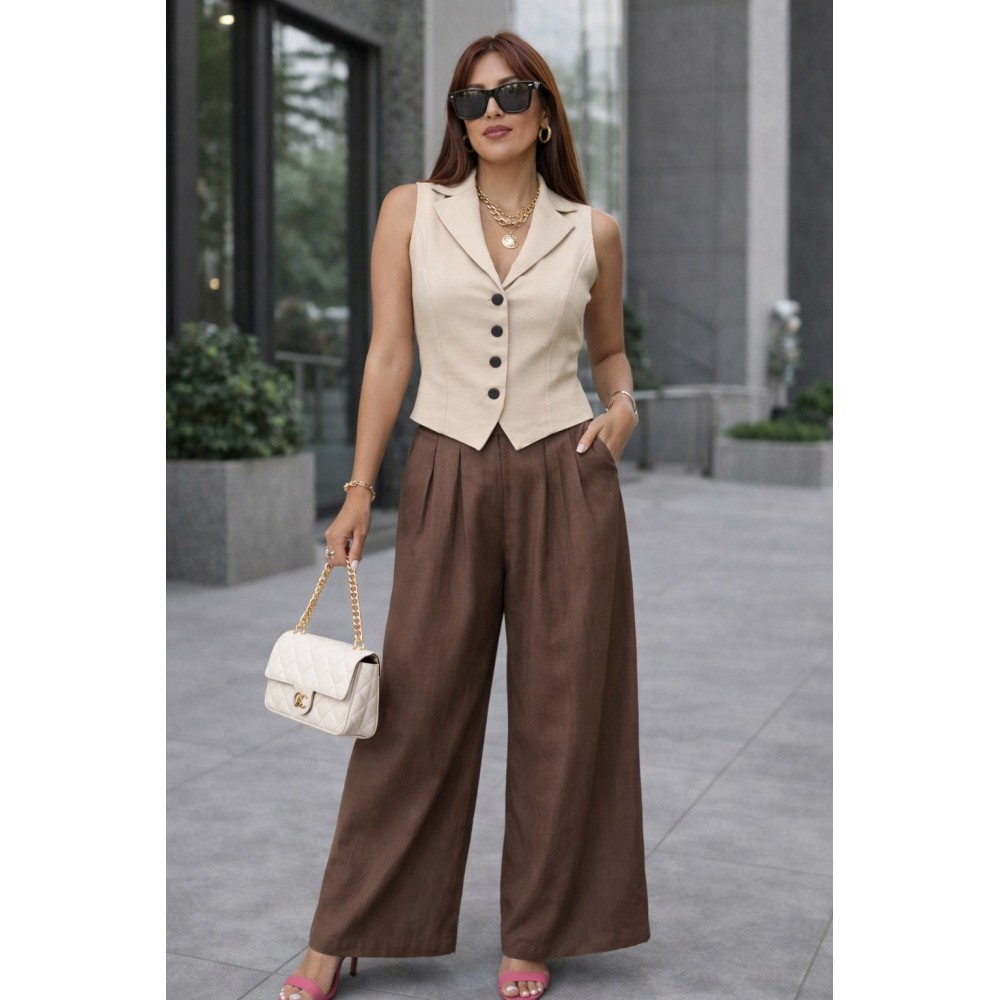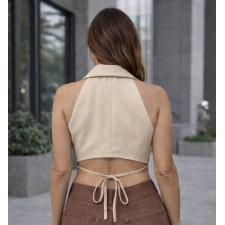 Un básico elevado que redefine la elegancia moderna. Este chaleco halter combina estructura sastrera al frente con una espalda abierta y ajuste regulable que realza la silueta con sutileza y carácter.