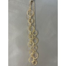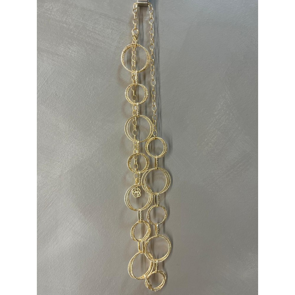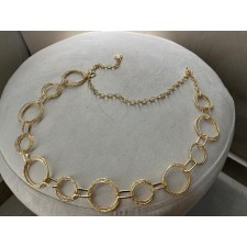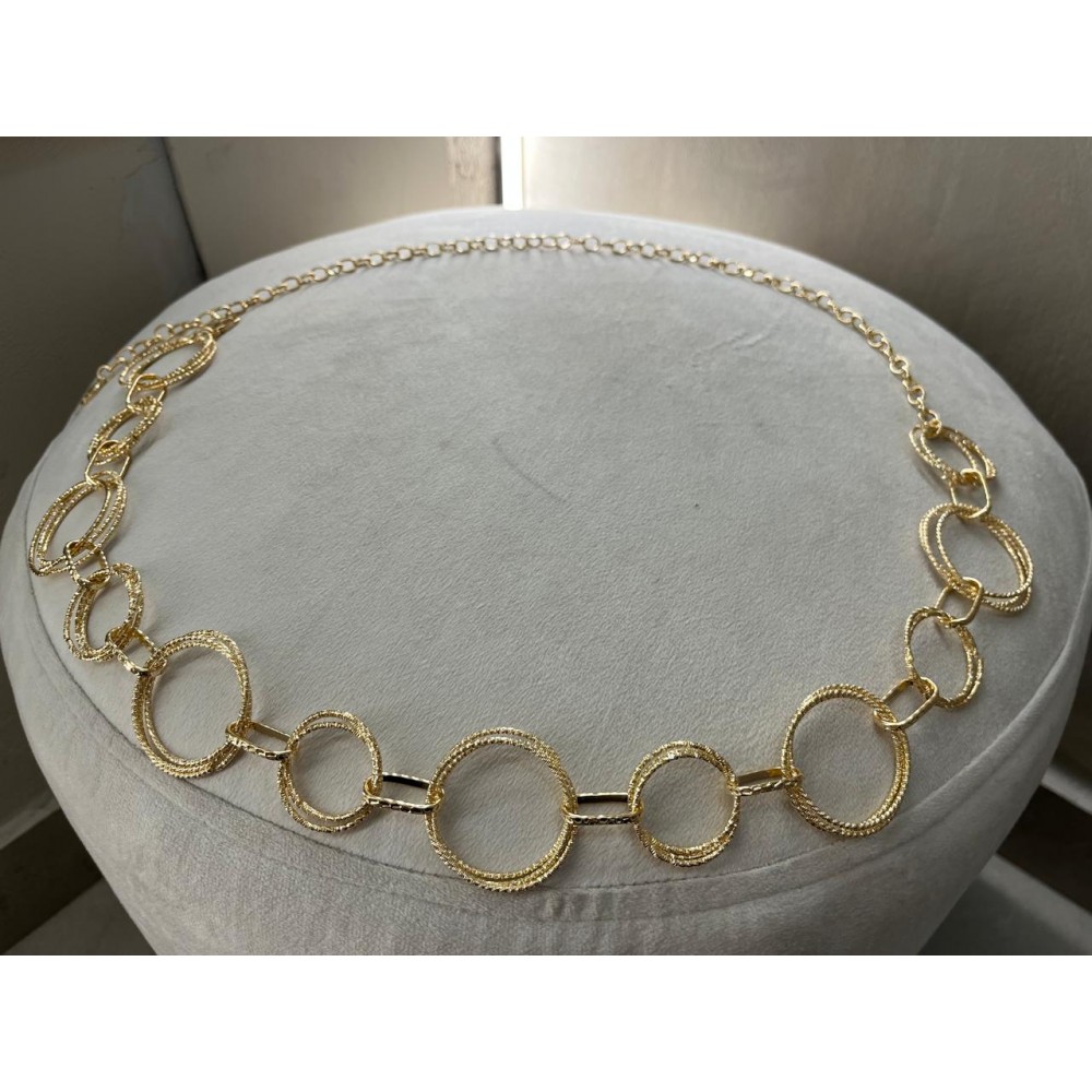Eleva cualquier outfit con este sofisticado cinturón dorado de diseño circular. Su estructura de aros entrelazados en diferentes tamaños crea un efecto moderno y femenino que estiliza la silueta y aporta un toque de brillo sutil.