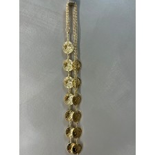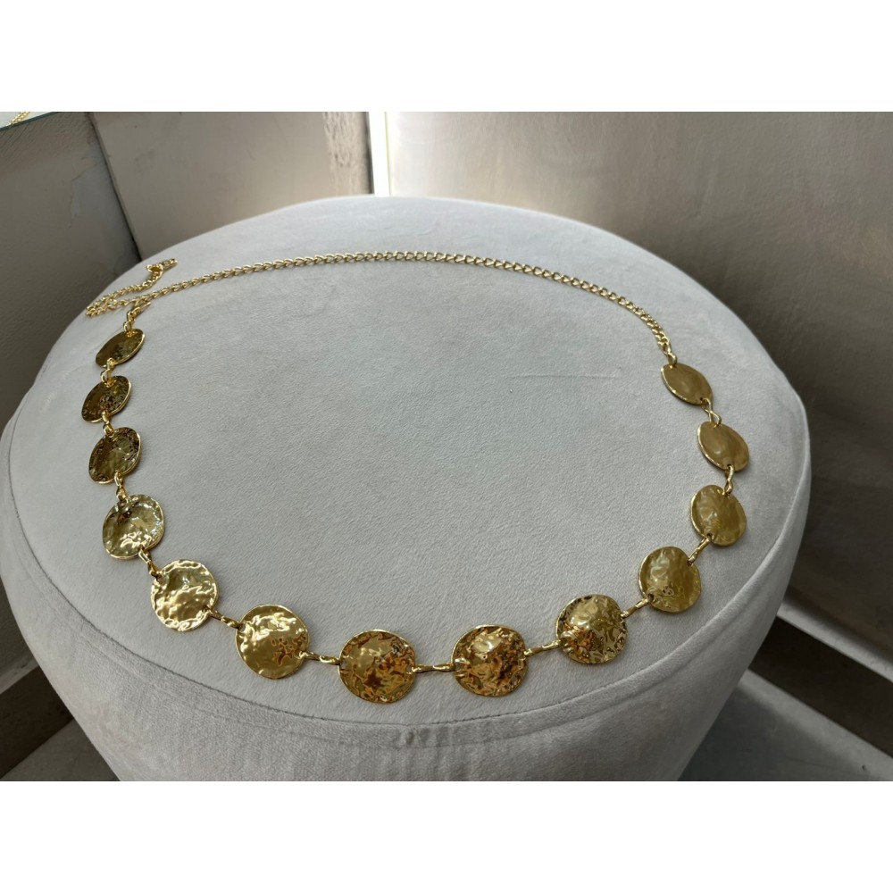 Añade un toque de luz y sofisticación a tus looks con este elegante cinturón dorado de discos martillados. Su diseño de placas circulares con acabado texturizado refleja la luz de forma sutil, creando un efecto brillante y llamativo sin perder la elegancia.