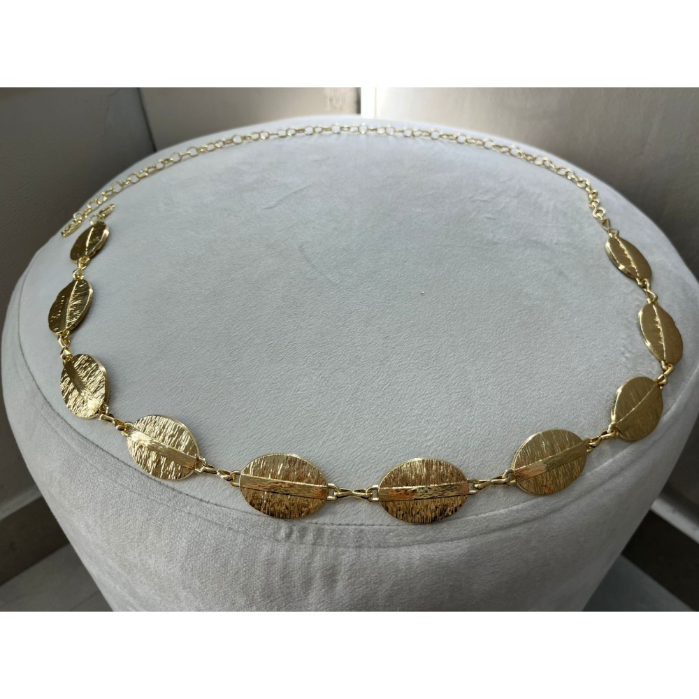 Este cinturón de eslabones dorados está compuesto por piezas ovaladas texturizadas que capturan la luz con un brillo elegante y sofisticado. Su diseño limpio y estructurado lo convierte en el complemento perfecto para estilismos minimalistas que buscan un detalle protagonista.