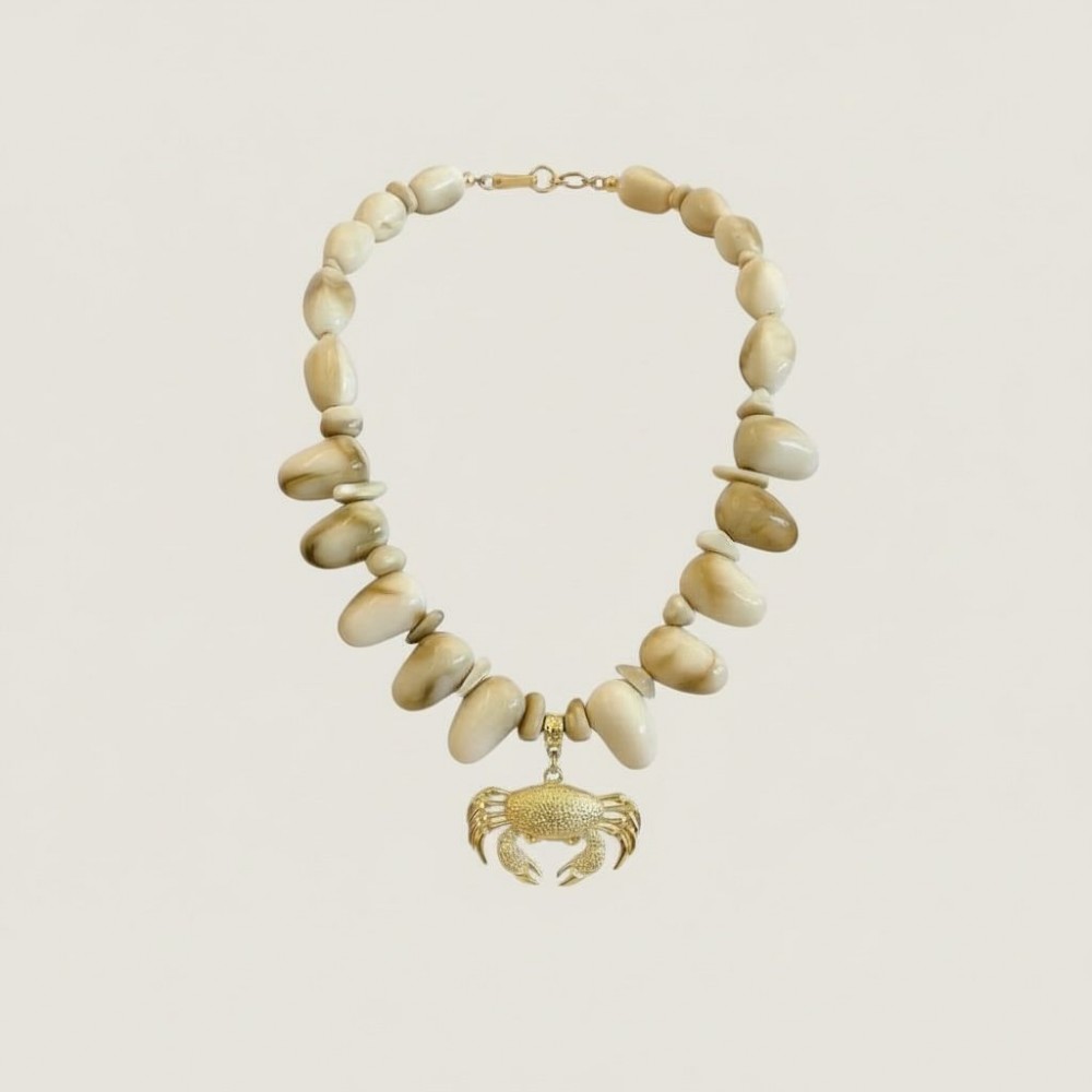 Este collar combina piedras en tono terracota profundo y tono marfil con un colgante dorado protagonista en forma de cangrejo, creando una fusión perfecta entre fuerza y sofisticación. Es ese accesorio que no pasa desapercibido y transforma por completo cualquier look básico en una declaración de estilo.