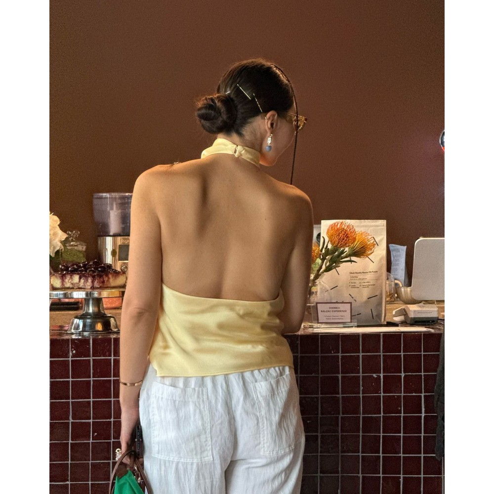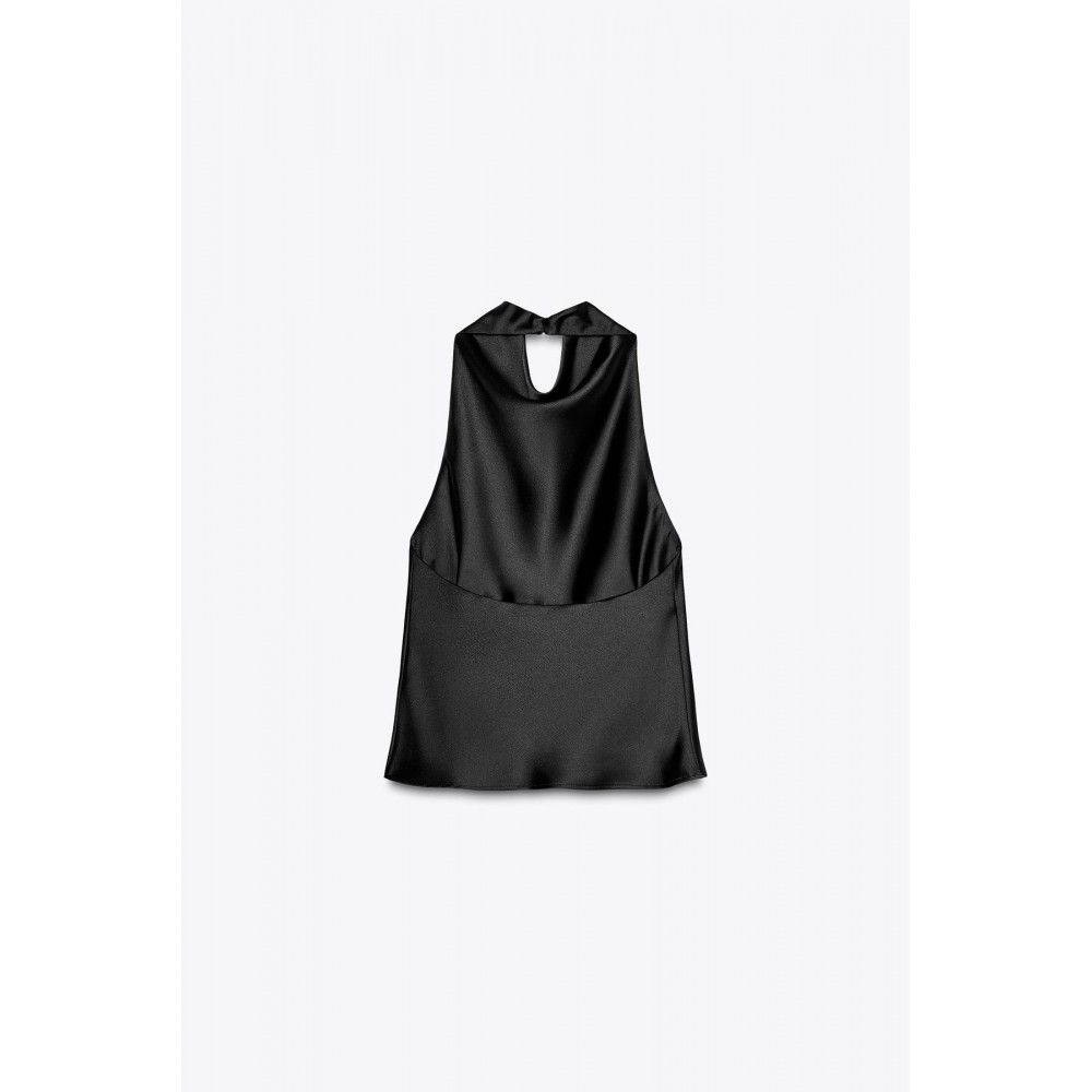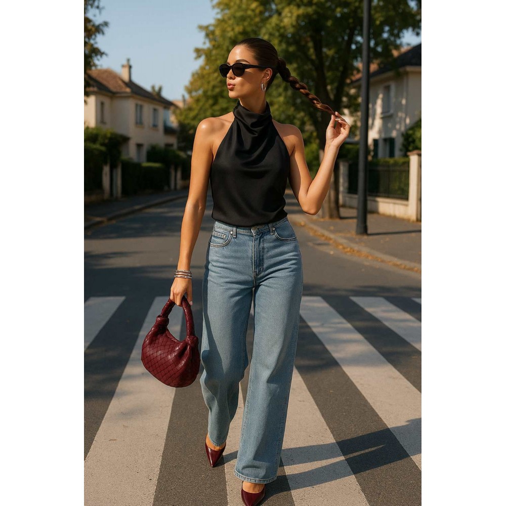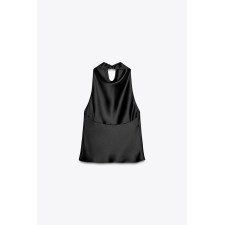 El Top Halter está confeccionado en tela satinada de acabado brillante, con un cuello drapeado estructurado que aporta elegancia inmediata y un aire sofisticado sin esfuerzo.