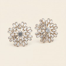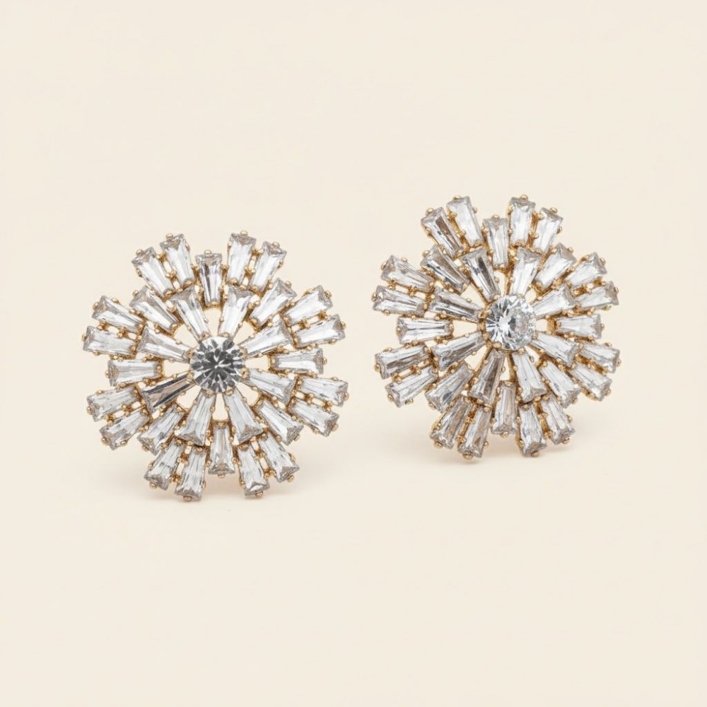 Diseñados para brillar. Estos aros en forma de estrella radial combinan cristales facetados con una estructura dorada delicada que captura la luz desde todos los ángulos. Su diseño tipo “sunburst” crea un efecto luminoso que enmarca el rostro con elegancia y sofisticación.