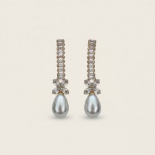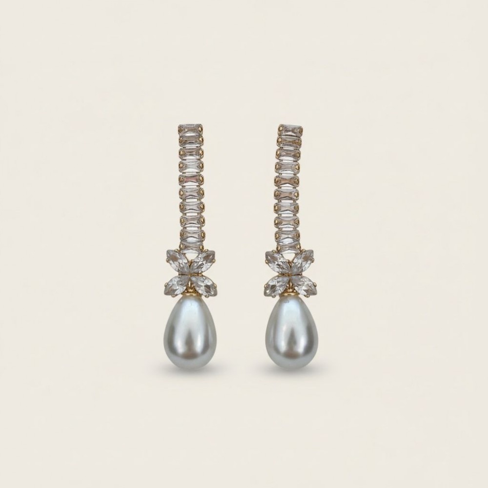 Sofisticación en su forma más delicada. Estos aros largos combinan una línea vertical de cristales facetados con un detalle floral brillante y una perla colgante en forma de lágrima que aporta movimiento, luz y elegancia absoluta.