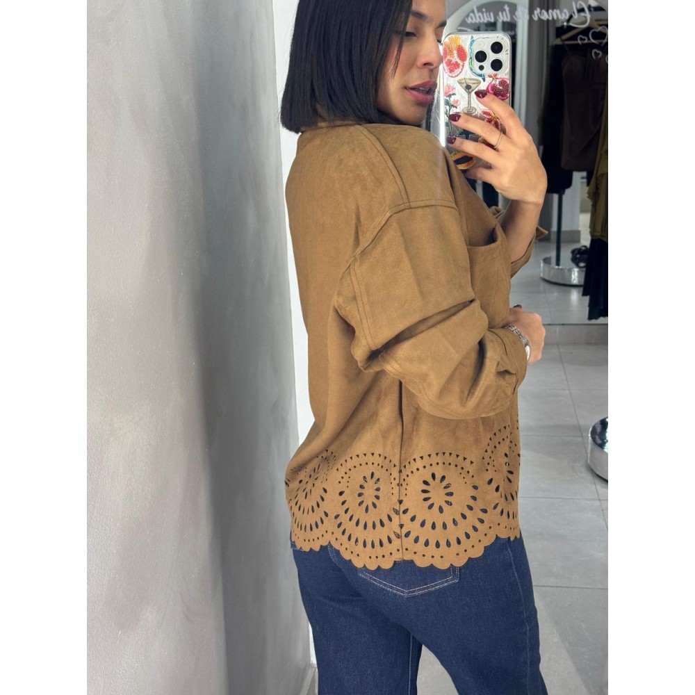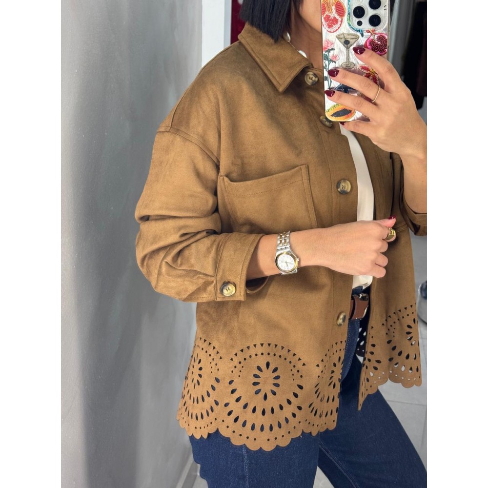 Esta chaqueta en tono café está confeccionada en gamuza ligera de tacto suave, ideal para temporadas de transición o para usar como tercera pieza estratégica que transforma cualquier look.