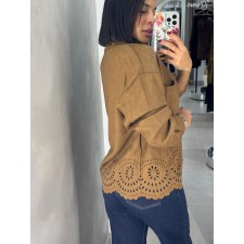 Su diseño de líneas limpias, bolsillos frontales funcionales y delicado calado decorativo en el borde inferior aporta un detalle femenino y diferenciador sin perder elegancia. La estructura es liviana, cómoda y fácil de combinar, logrando un equilibrio perfecto entre pulido y relajado.