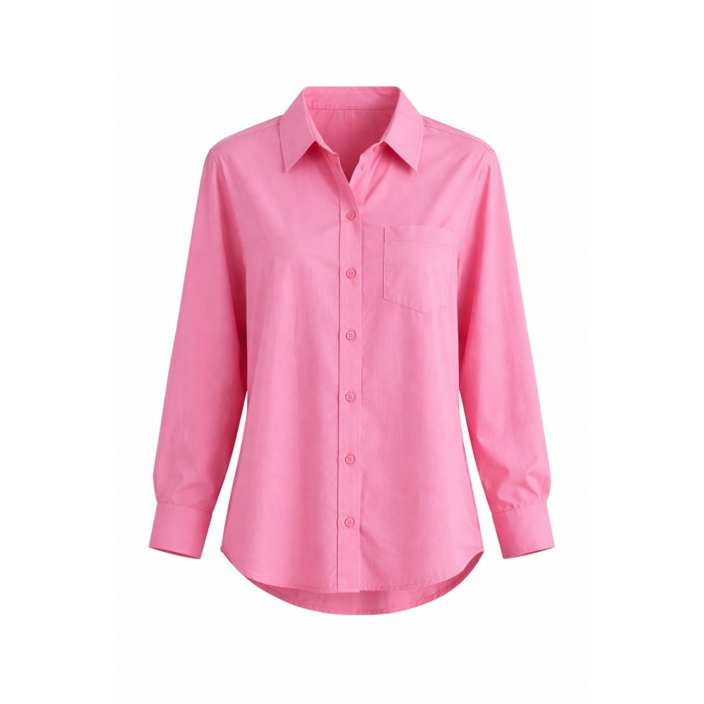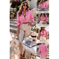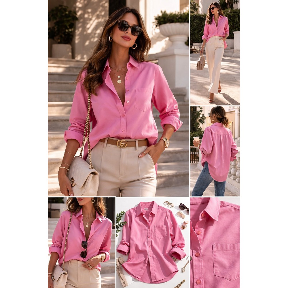 La clásica camisa reinventada en un tono rosa vibrante que ilumina el rostro y eleva cualquier look al instante. Su silueta ligeramente oversize permite llevarla abierta, semi abierta o completamente abotonada, adaptándose desde un outfit casual sofisticado hasta uno más estructurado y elegante.