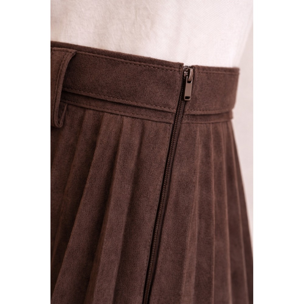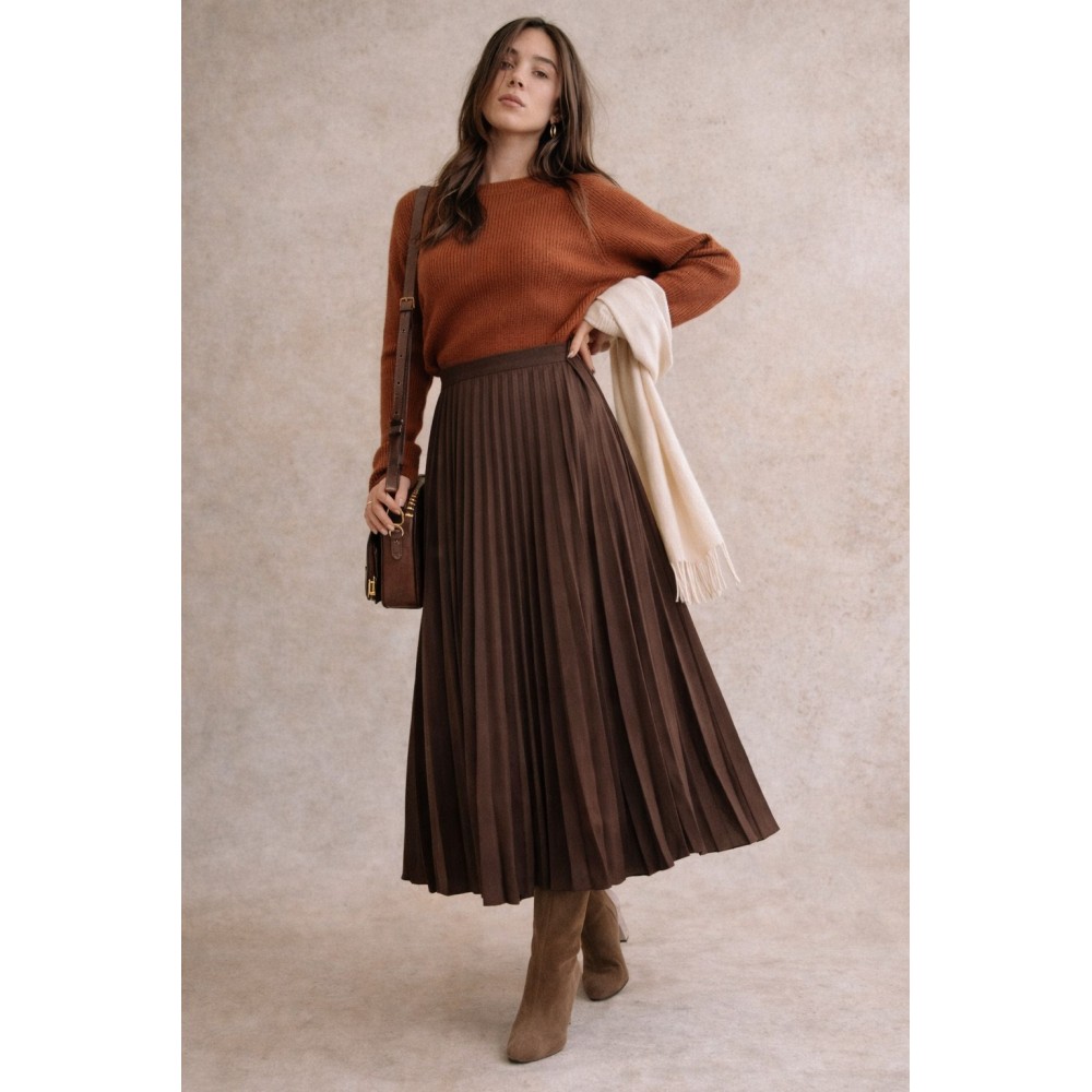 Una prenda atemporal que combina elegancia y versatilidad. Nuestra falda midi plisada está confeccionada en un suave acabado gamuzado que aporta textura y sofisticación a cualquier look. Su silueta fluida y plisados definidos estilizan la figura, mientras que su largo midi la convierte en una opción perfecta tanto para looks casuales como más elegantes.