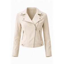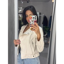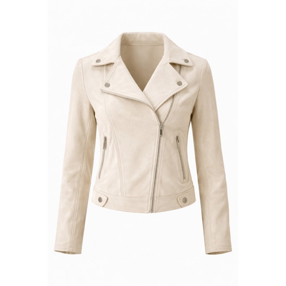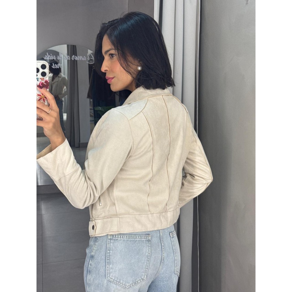 Una chaqueta que combina actitud y sofisticación. Confeccionada en gamuza ligera de textura suave, este diseño estilo biker destaca por su corte estructurado y cierre asimétrico, creando una silueta moderna y favorecedora.