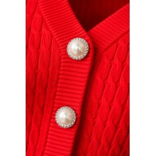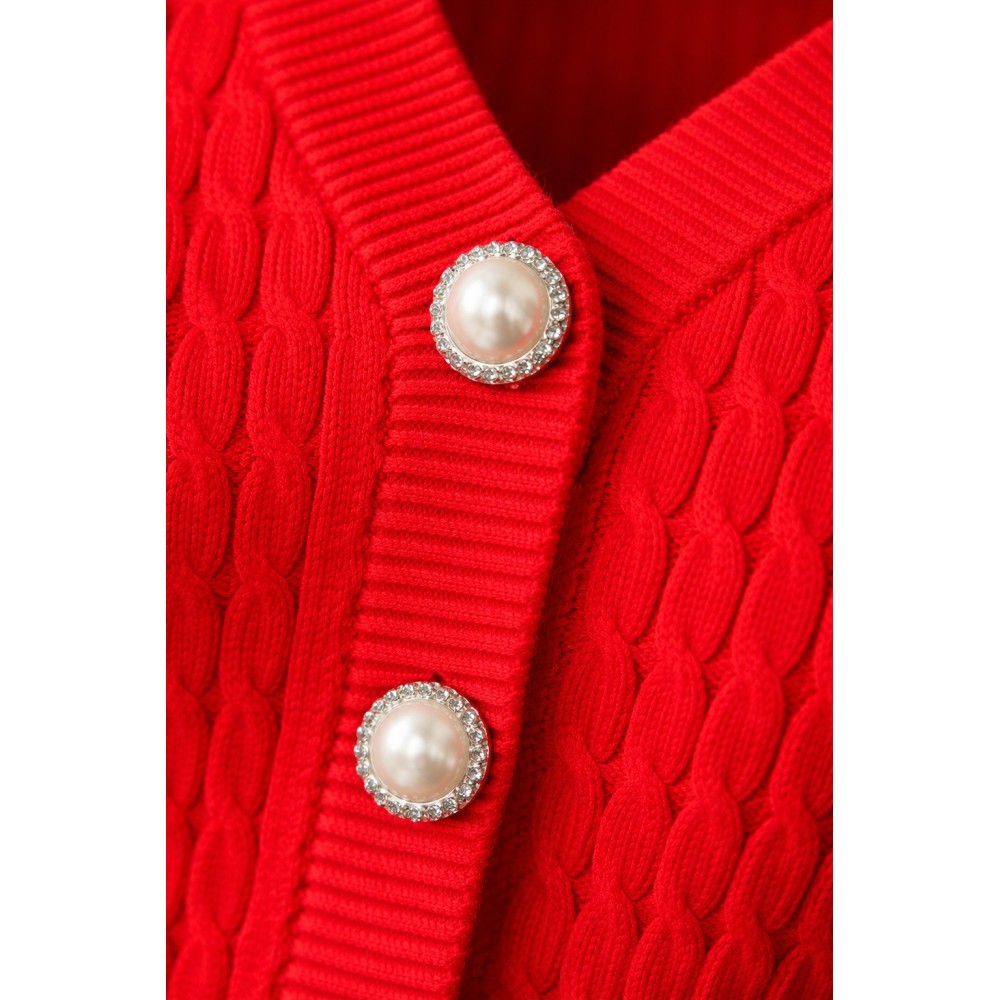Su escote en V y cierre frontal con botones de perla rodeados de brillantes plateados añaden un detalle distintivo que eleva la prenda, convirtiéndola en una pieza ideal tanto para looks casuales como más refinados.