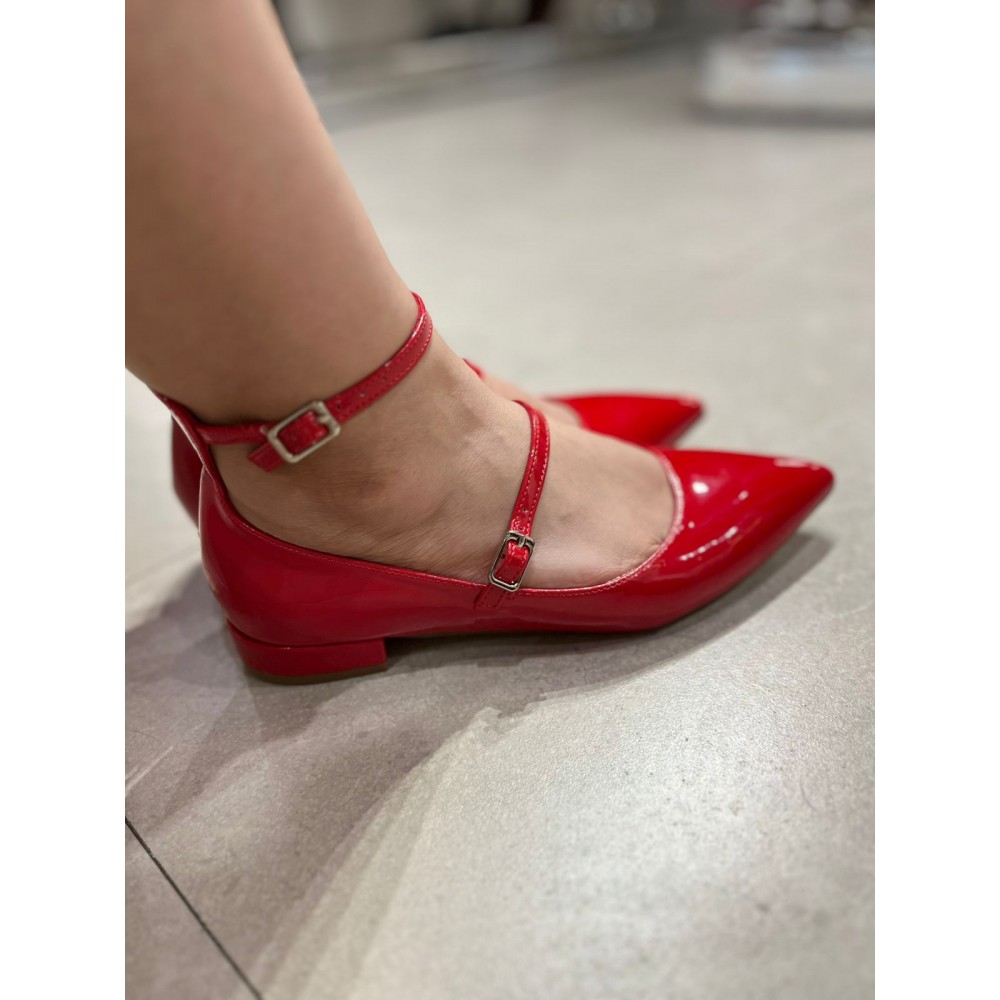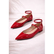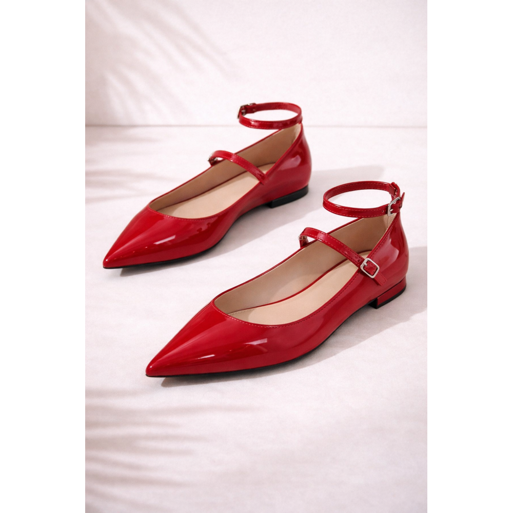 Ballerinas en acabado charol rojo intenso, diseñadas para destacar con un aire femenino y sofisticado. Su silueta de punta fina estiliza el pie, mientras las delicadas pulseras con hebilla aportan sujeción y un detalle elegante que eleva el diseño.