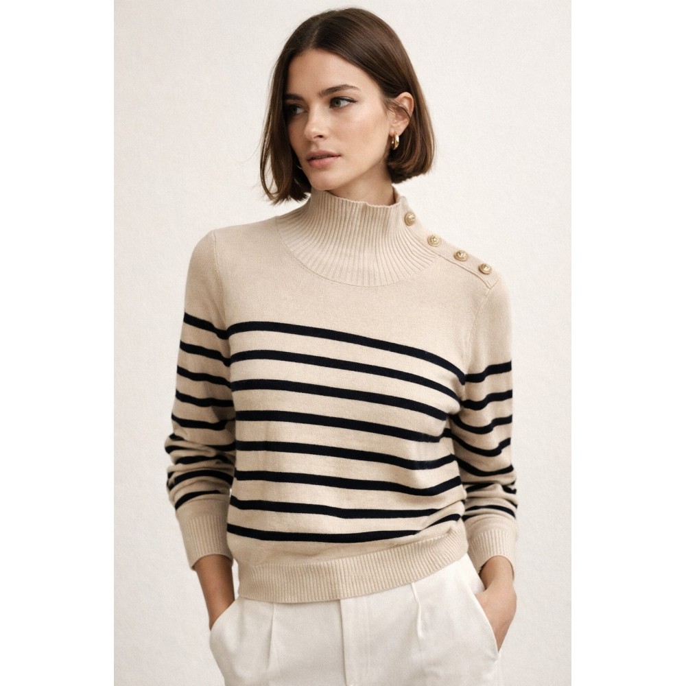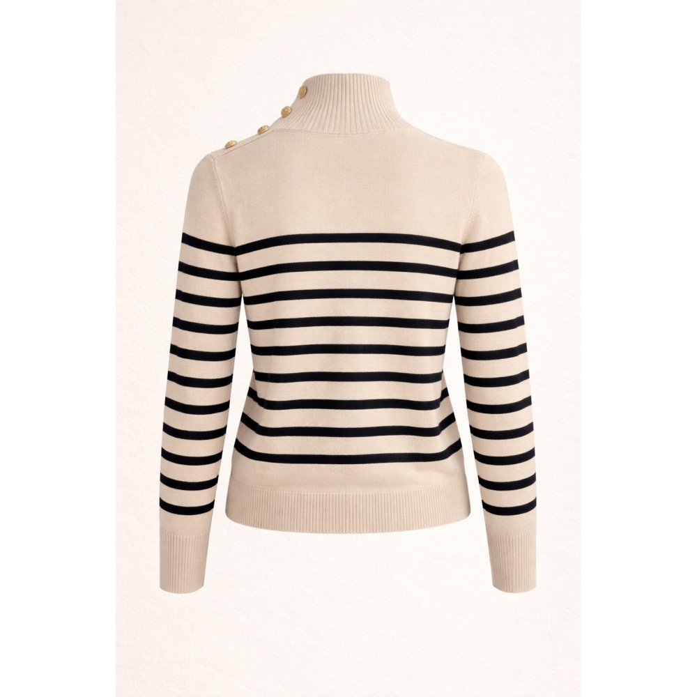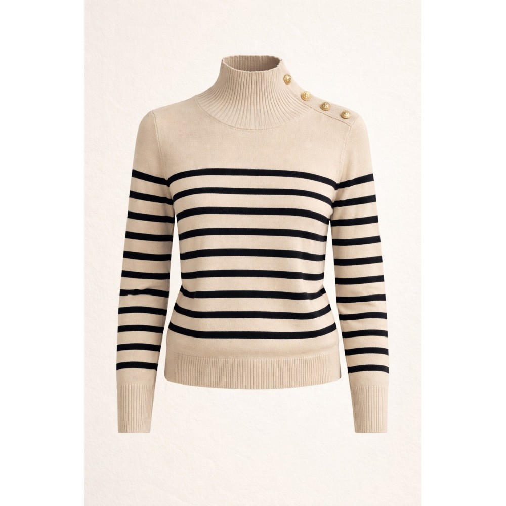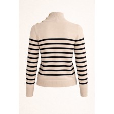 Suéter de tejido suave en tono marfil, con diseño de rayas horizontales en contraste que aportan un aire clásico y atemporal. Su cuello alto estructurado estiliza la silueta, mientras que los botones dorados en el hombro añaden un detalle sofisticado y distintivo. Detalles: