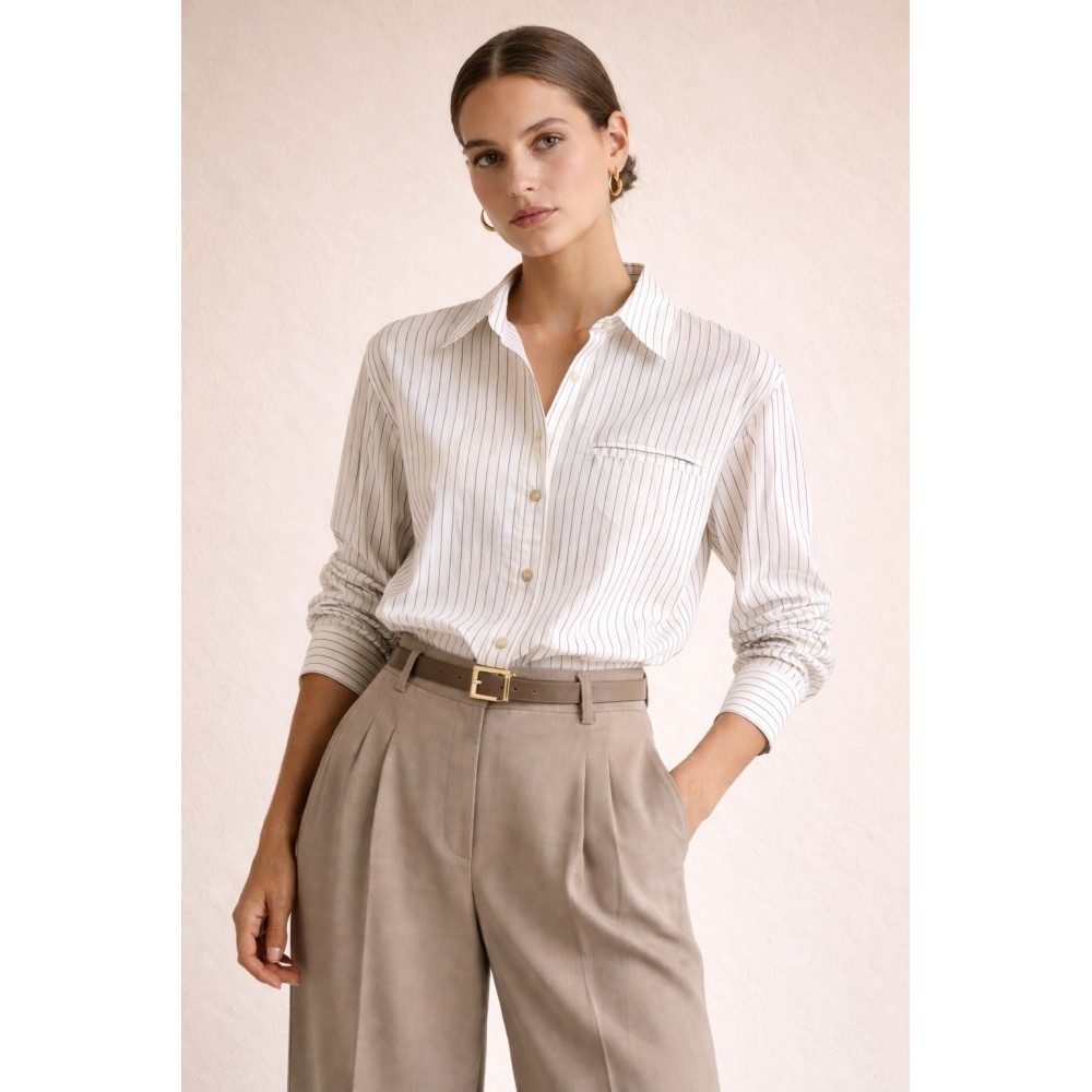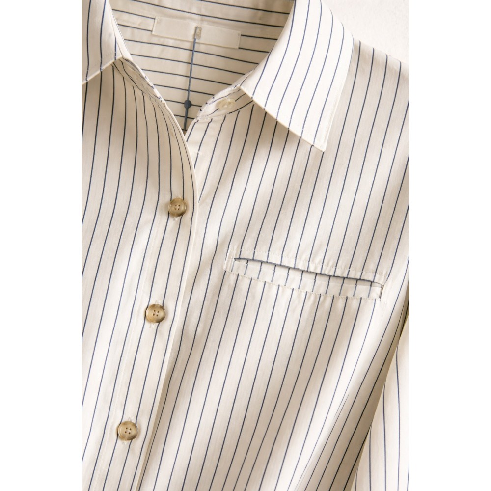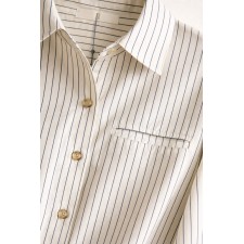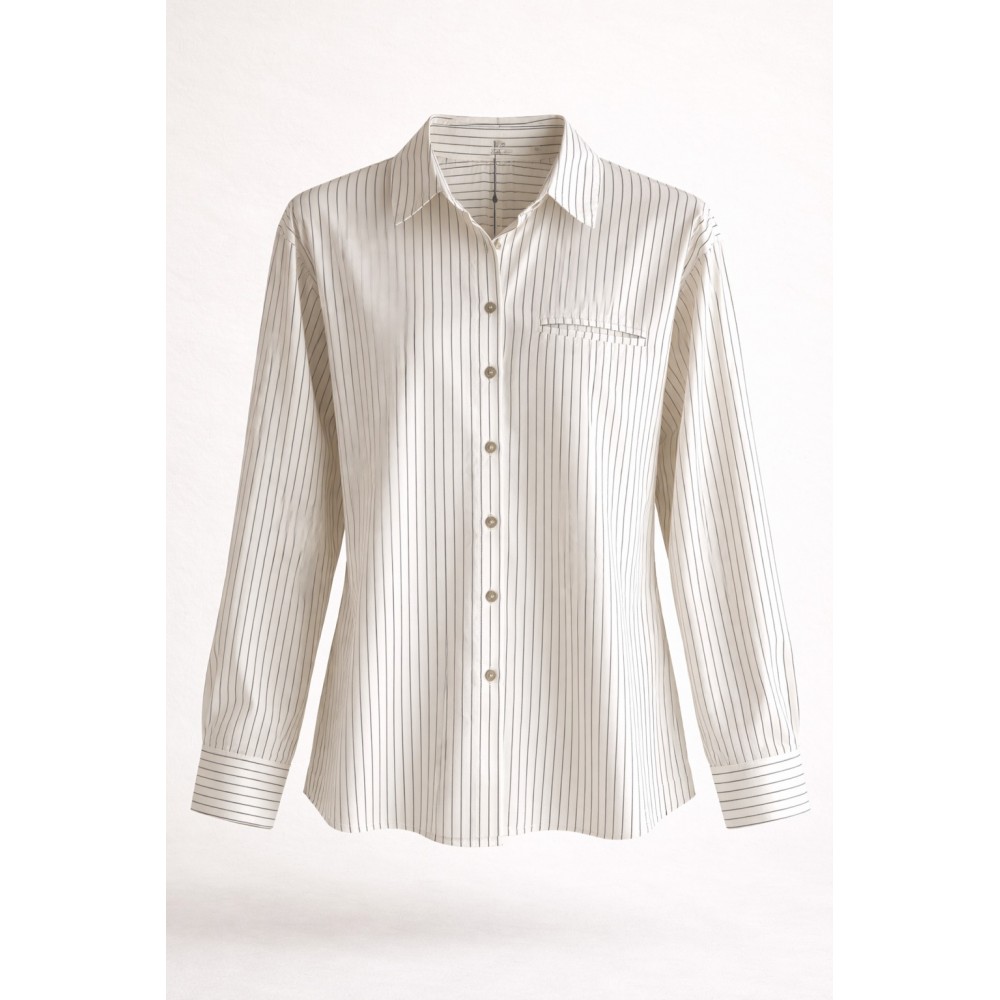 Camisa de líneas limpias y elegantes, confeccionada en un tejido liviano que aporta fluidez y comodidad en cada movimiento. Su diseño de rayas finas verticales estiliza la silueta, convirtiéndola en un básico sofisticado y atemporal.